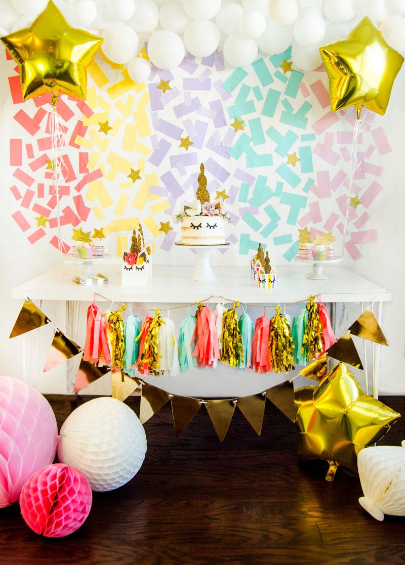 Using colorful paper in confetti shapes and taping them to your wall or backdrop, you can create one heck of a birthday bash backdrop.