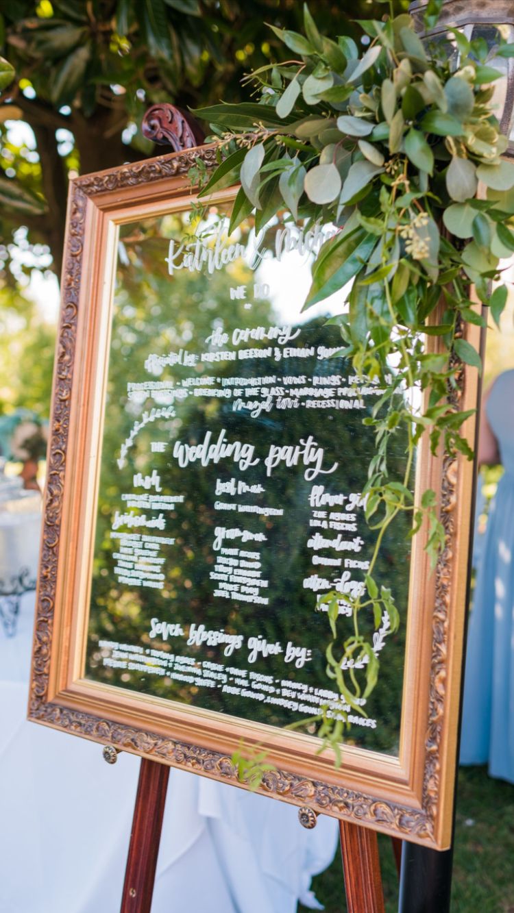 Create your own, unique, and beautiful sign like this mirrored design. They simply took a gorgeous mirror and used a paint pen to write out all their desired details.