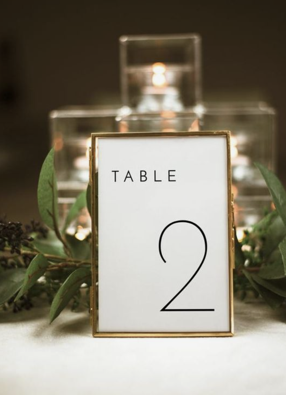 By grabbing a few more gold frames (like these ones from the idea above) you can print out some simple table numbers and use them for your guests to easily find their seat.