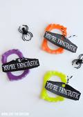 This idea is for all you moms whose schools have banned candy on Halloween (what’s with that anyway?) or whose children have extreme food allergies. This non-candy Halloween idea entails purchasing plastic fangs at Target (you can buy 24 for three dollars), downloading and printing this FREE ‘You’re Fantastic’ printable, cutting the printable and tying them to the plastic toys. It took me about twenty minutes to do all 24 for my daughter’s class. My girls thought they were super cool (typically a huge stumbling block to most my crafts:) and are excited to hand them out on Halloween.