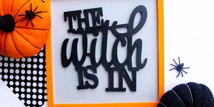6. Hot glue ‘The Witch Is In’ sign to the center of the DIY Farmhouse Sign.